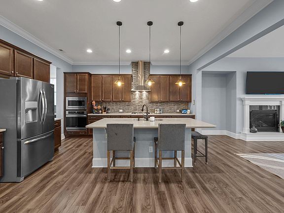 This spacious home was made for entertaining! The heart of the home is the chef's kitchen that's open to the casual dining area, and to the family room. Beautiful hardwood-style floors flow throughout the main living areas. Kitchen offers a butler's pantry, stained cabinets w/crown trim, mosaic tile backsplash, huge center island w/breakfast bar seating, stainless steel appliances include a gas cooktop, stainless steel hood vent, built-in wall oven, microwave & dishwasher. 1st floor office with crown molding & access to the screened porch overlooking the large backyard. 1st floor guest/in-law suite w/full bath. Bright 2nd floor owners suite with a trey ceiling, adjoins the owner's bath with 2 separate vanities, marble-inspired tile floors, garden tub & oversized shower with tile surround to the ceiling. Huge 2-sided owners WIC.  Family room features vaulted ceilings, 8-blade propeller style ceiling fan with light, recessed niches for future built-ins & gas log fireplace with custom mantel.  Finished basement w/game room, flex space, bedroom, full bath, and exercise room. Patio off game room. *The gym and flex room weren't permitted, but are included in the square footage.