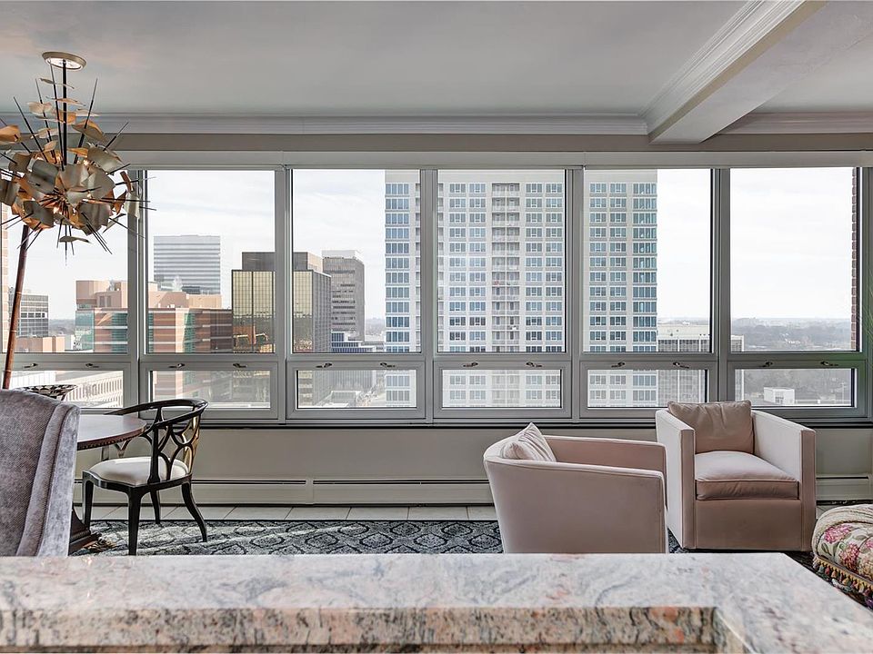 Posh penthouse living beckons from this townhome-style condo in the heart of downtown Clayton. This 2b/2.5ba penthouse in Park Tower Condos features almost 1600 sqft of tastefully finished living space, including a stunning kitchen and a grand LR featuring ornate moldings and walls of windows with remote-operated window covering. The kitchen offers a center island, granite counters and stainless appliances, including a wine fridge. The UL boasts wood floors, 2 bedrooms including a MBS with multiple closets, built-ins and an opulent bath with jet-tub. The 2nd bed features stunning views and a closet that can accommodate a stackable washer/dryer. Another full bath finishes the UL. Luxury living at its finest with amenities: 24/7 doorman, rooftop pool, workout room, library, party/conference room, two assigned garage parking spaces and a storage unit-all this in an unbeatable location, just upstairs from Dominic's Trattoria & across from Shaw Park's pool, ice-skating rink & tennis courts.