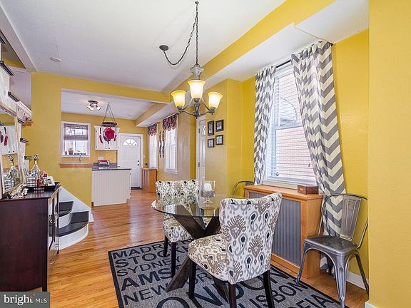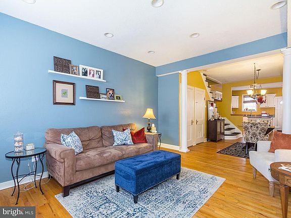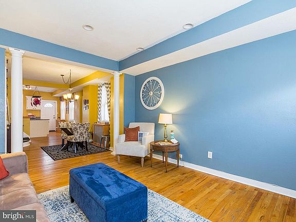 DISTINCTIVE END OF GROUP ROWHOME WITH 3 FINISHED LEVELS & OVERSIZED PARKING PAD! Open floor plan w/ hw floors throughout, spacious LR w/ ornate columns, separate dining room, updated island kit w/ granite counters, upper level w/ 2 large bedrooms, sitting area, & full bath, finished basement w/ 3rd bedroom, half bath, & laundry room, spacious rear deck, & large parking pad for up to 2 cars!