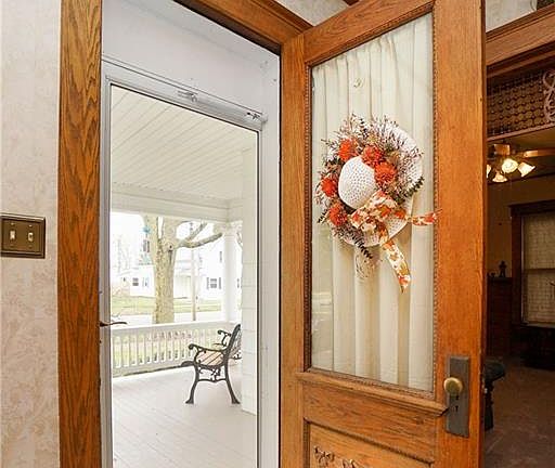 Victorian farmhouse with beautiful woodwork throughout. Kitchen has island. Large covered porch for relaxing, large yard, 3 car space, overhead opener, plus workshop w/loft. Sheds on each side. Cute garden shed with electric. Basement has craft area and work bench area. Attic has lots of storage! Large closets throughout. A must see!!!