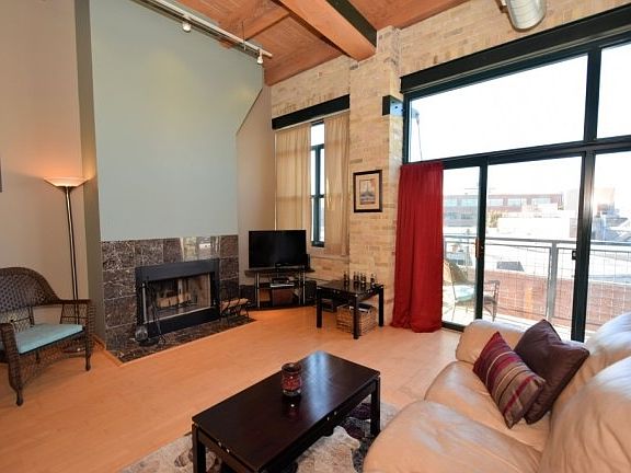Grab a little slice of history in this converted warehouse built in 1875. Original cream city brick walls, high ceilings, and heavy timber rafters add historic charm to the modern loft living. South view floods natural light through the entire space and the fireplace adds cozy comfort. This unit is move-in ready! Private boat slip, balcony, parking space, storage locker, fitness center & rooftop patio included! Perfect for entertaining before festivals or a night out.