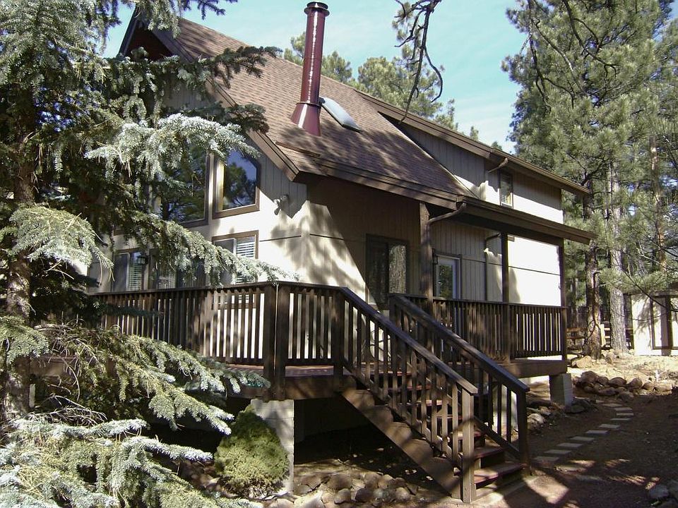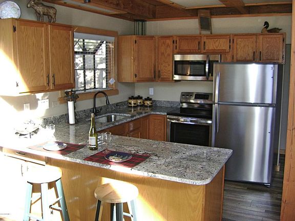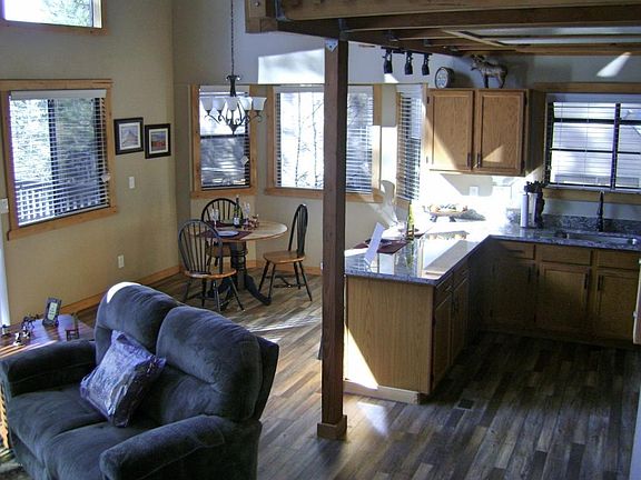 Remodeled Mountain Chalet has 3 bedrooms plus large loft and 3 bathrooms. Vaulted T&G ceilings throughout with skylights. Completely remodeled with new floors throughout, new paint inside and out, new wood trim throughout. New granite counter-tops kitchen and bathrooms. New sinks and faucets & new vanities and toilets. New rubbed bronze accents including new door knobs and locks. New ceiling fans and light fixtures. New decor switches, plugs & GFI's. New stainless appliances, new window blinds and New forced air electric furnace. Large shed for all your stuff. All this and comes with a One Year Home Warranty.