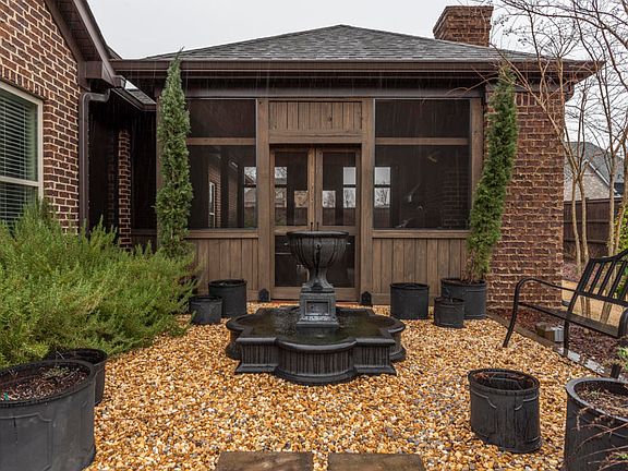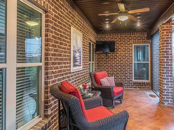 Castle front door upon entry sets the mood for this custom home which is perfect for entertaining and offers open floor plan with stone fireplace inside and brick fireplace outside in covered and screened-in kitchen with grill,refrigerator,tongue in groove pine ceilings and flat screen television. Family room with stone fireplace opens to dining room, kitchen and keeping room. Guests have plenty of room to spread out & watch multiple televisions for gameday weekends. (4 televisions included with the home). Travertine floors in kitchen area & hardwood floors throughout remainder of the downstairs make spills easy to wipe up. Fenced yard, security system, outdoor fountain and sprinkler system add to the professionally landscaped yard. Ride your golf cart to tee off on the first green!