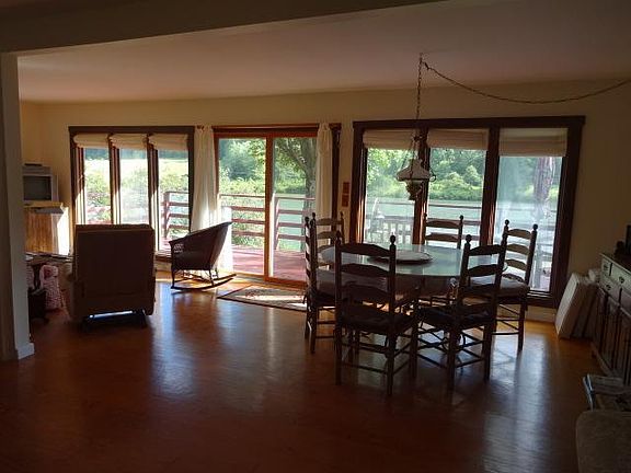 Step into this house and you see the best of lakeside living. The entire front of the house is glass to reinforce why your there. THE LAKE.The first floor offers an open floor plan, wood floors and a wood burning stove to take the chill off.(house offers an oil hot air heating system if wood burning is not your thing) The first floor has a full bath and 2 bedrooms. 2nd floor lg master bedroom with walk-in closet and built in storage. 2nd floor offers a large full bath with jacuzzi tub and open loft suitable for sleeping space, office, TV room. Lower level a very large playroom. The lot is beautiful and offers play space on the terra-ferma. Lake is extremely private with ony a handful of homes, swim fish, boat or just enjoy the view.