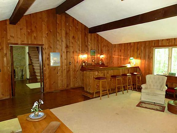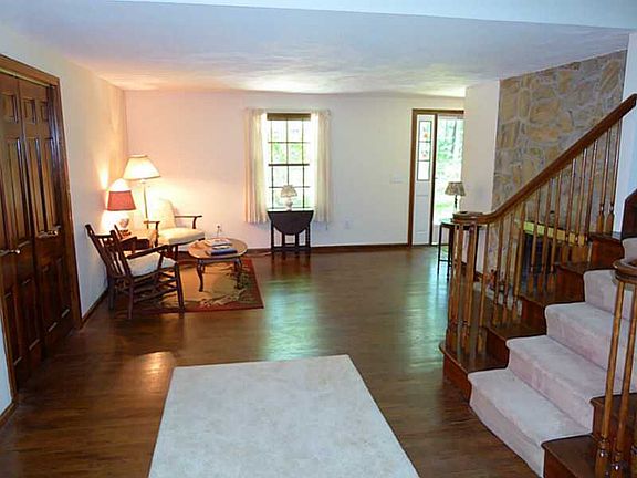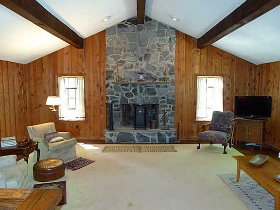 Saltbox Colonial on a wooded 2 acres w/ a 24x24 Great Room that has a cathedral beamed ceiling, stone hearth & dry bar. Two more stone fireplaces in the living room and master. Hardwoods throughout, a first floor bedroom & bath, and a 12x22 deck.