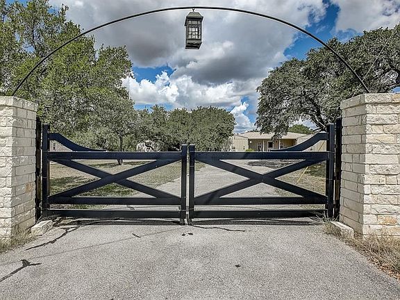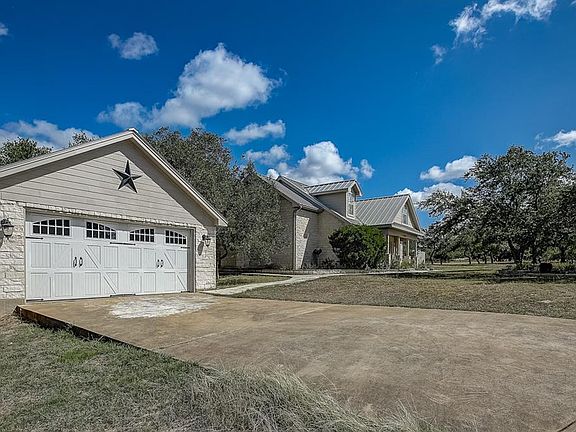 White stone traditional farm house with separate guesthouse/office on 10+ acres of beautiful Texas hill country property. Soaring vaulted ceiling in the living room with floor-to-ceiling white stone, wood-burning fireplace. Spacious eat-in kitchen features custom cabinetry with ample storage, granite countertops, tumbled limestone backsplash and high-end stainless appliances. The custom cabinetry carries throughout the laundry/mud room and main bathroom. Large tumbled limestone tiled shower in the main bath with both stationary and hand-held shower heads. Travertine tile and scraped wood flooring throughout home. Huge closet in the main bedroom with built-ins. White stone two-car garage with overhead storage. Matching white stone well house with 467 ft deep well. Three (2500 gal) water storage tanks. Water softener with reverse osmosis to the refrigerator and prep sink. 2 bedroom/2 bath guest house is spacious and comfortable with large country porches. Separate drive makes it perfect for rental or a home office. Property features perimeter and cross fencing, a 2-stall pole barn, a wet-weather pond and creek, a huge chicken coop, and a stocked goldfish/koi pond with waterfall. Stone walkways and patios with fire pit. Large 40x60 concrete pad is in place for easy addition of a barn or stable. Standing-seam metal roof on main house, well house and garage. Property is mostly clear of cedars, leaving over 500 beautiful oak trees! Enjoy beautiful sunrises and breathtaking sunsets. The dark night skies are perfect for stargazing! Everything you want in the country, but close to city amenities - 30 minutes to Austin!