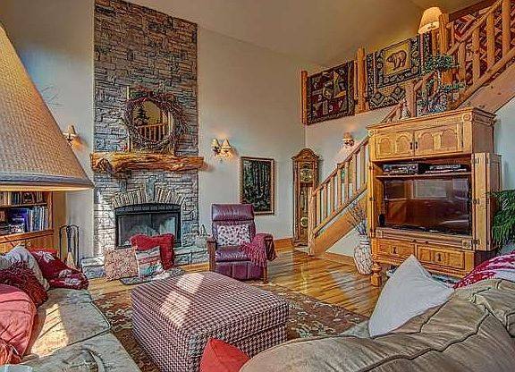 Here is a Beautiful cabin located in the TRACKROCK AREA to enjoy the mountain views 4BR/3BA Vaulted ceiling with a stacked stone wood burning fireplace that will wow your guests. The kitchen is spacious & very nice with stainless steel appliances, with a gas stove and Corian counter-tops with ample storage. A large sun room used as a dining room to entertain. The upper level has a large loft and master with ensuite. Full, finished basement with another fireplace/gas, living/game room and 2BR/1BA with one being another large master bedroom. Wood exterior with beautiful stacked stone accent. 2 Car Garage, multiple stone patios, fenced area, Fire-pits, pergola with sitting area.
