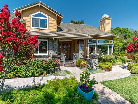 Visually Pleasing! This home is beautifully updated and boasts five bedrooms, four full baths. plus an office/den/media room. Custom Kitchen has plenty of counter space, breakfast nook and a walk in pantry with extra storage. Kitchen living room combo features a wet bar and custom tiled fireplace. Primary suite, bedroom and two full baths on main floor. Primary suite incudes a fireplace. Three bedrooms including a Jack and Jill bedroom on second floor plus an extra large bonus room for crafting, office space, media/play room or extra storage. Formal dining room includes a custom fireplace. 3/4 inch solid hardwood flooring throughout the home. Indoor laundry room includes a sink and an extra large butcher block counter top. Unique luxury features throughout the home and property. Located in the Scenic Cielo Vista neighborhood. Owned Solar. This half acre lot includes (2) 20 foot Steel pergolas with pavered bases, a raised redwood deck with a swim spa-hot tub combo. Fruit Trees!