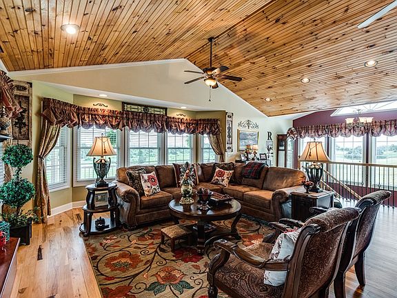Elegant cottage style & English countryside charm, make this home so appealing to Dale Hollow Lake (2 miles) and land lovers (3.4 ac). Instantly you're greeted with impeccable landscaping from a variety of fruit and Magnolia trees, roses and hydrangeas (even a grapevine or 2) polished off with trimmed boxwoods, leading to a super spacious (3600 sft) delightful serendipitous family home w/ all perks you could want:Anderson windows (super views of Mtns and meadows), Hickory and tile floors (no carpet) gas FP, granite tops, custom cherry cabinets thruout, open dining,kitchen,living (+bar seating) T&G vaulted, main-level master suite and guest bedrms 2&3, full bath, XL laundry (sink,wall iron board)walk in pantry, lots of closets. Lower level den, office, music rm, 2nd master suite, mech. rm, plus trex upper deck and lower flagstone patio, gazebo & fire pit, 26x26 garage & 30x50 man cave PLUS 3.4 fenced acs (horses) Duel fuel HVAC, PEX plumbing, tankless W/H, sauna shower, stainless appl!