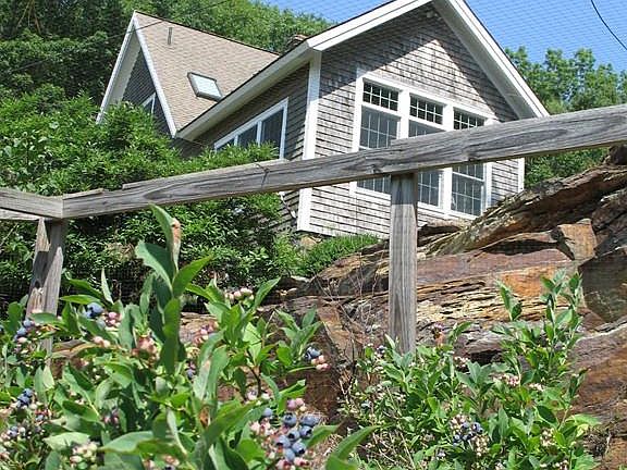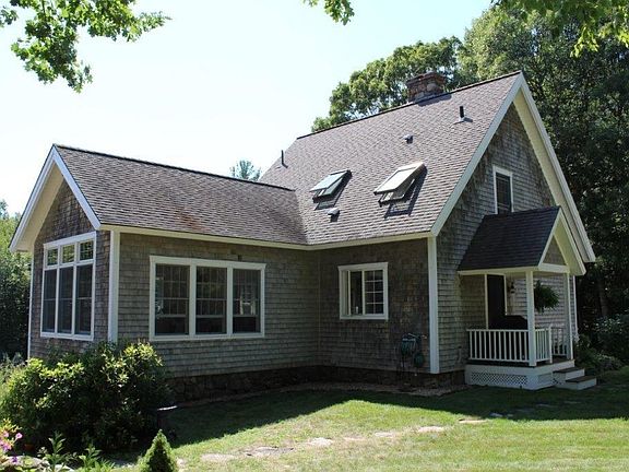 Outstanding single owner Country Cape on over 18 acres with pretty views. Privately set back on a lightly traveled road with abutting state owned land & numerous trails, this custom built home overlooks perennial gardens, fenced in blueberry bushes & a spacious lawn. Enjoy the view from the ledge top overlooking the distant valley & woodland. Home features a country cottage look with a stone outer layer over concrete foundation, natural gray shake color, covered porch entries, lots of southerly facing windows for natural light & passive solar heat. Hardwood floors throughout the 1st & 2nd flr living areas, huge kitchen with custom cabinets, granite counters, dining area & pretty exterior views. Sun drenched Family Room with cathedral ceiling, loads of windows & skylights. Formal Living Room with fireplace & built-ins leads to foyer with extra wide oak stairway to second floor bedrooms & bath. Finished lower level with bedroom, bath, TV area & walk-out to gardens. New 4 BR septic system