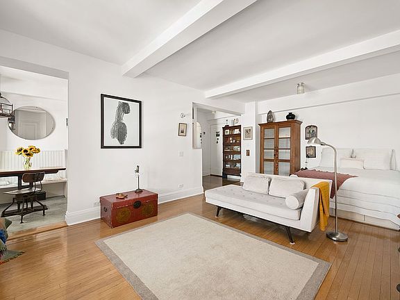 Upon entering the apartment, you’ll find the first closet and additional built-in storage throughout. The galley kitchen straight ahead was renovated and opened up to offer more light and usable space, complete with a banquette and the best spot to have coffee in. Stainless steel appliances- including dishwasher, refrigerator and gas stove- are updated. Unlike most studios, this is a real separate space where you can cook and eat comfortably. The living area is vast and works for many different studio configurations. There’s plenty of room for a sleeping cove, a true living area and a home office space. The floors are real hardwood. A large, built-out closet is the main storage and a clean, windowed, full bathroom with a tub is in the corner of the apartment. The entire apartment is warm and thoughtful.