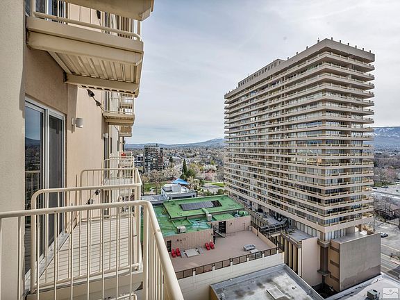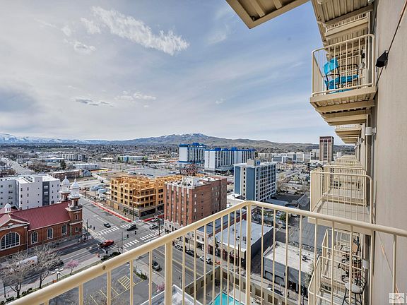 VIEWS, VIEWS, VIEWS, Don't miss this dual suite 2 bedroom, 2.5 bathroom, condo centrally located in the heart of downtown and amidst the future West 2nd District revitalization project, perched on the 12th floor with exquisite views of the Sierras and downtown area. Step out onto your 4 balconies and enjoy the views while having your morning coffee. This building has an attached underground parking with 2 spaces for the unit., The interior features beautiful upgrades including travertine/tile flooring/Stone with granite inlays, stainless steel appliances, granite counters, and elegant cherry wood cabinetry. The two primary suites both feature walk-in closets and private balconies, to enjoy the stunning city and mountain views from the 12th floor. Enjoy the downtown life and entertainment of Reno all within walking distance to include Wingfield Park, the Truckee River, Casinos, Restaurants, Theaters, Reno Ace's Ballpark, shopping, stores, and MORE, or take a short drive to other areas around town. Also 30 minutes from Lake Tahoe to enjoy additional outdoor activities, beach, and entertainment. Some Furnishings included, Others negotiable. Pictures don't do the Views Justice!