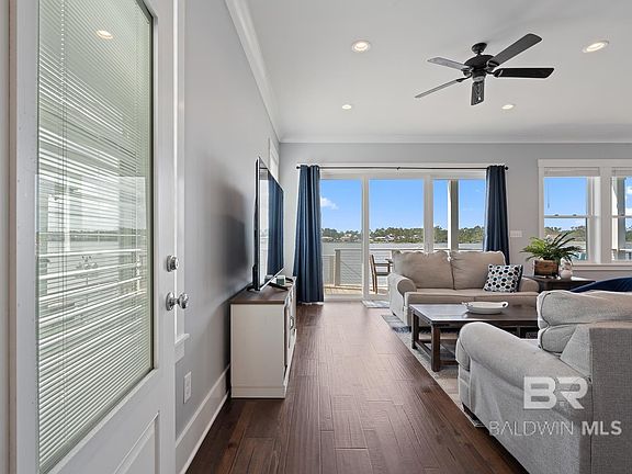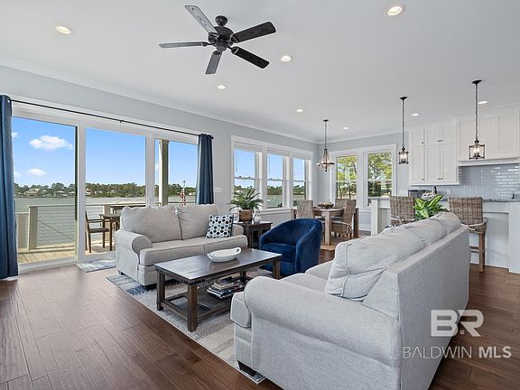 Built in 2019 to Gold Fortified standards, this custom lagoon-front home blends timeless coastal charm with high-quality craftsmanship and a prime location just a short walk from the beach, dining, and entertainment. Designed for comfort and durability, the home features Hardie board-and-batten with lap siding, enclosed stairs, wood-accented porches, and stainless cable railings. Enjoy sweeping views of Little Lagoon from the main living area and the primary suite. Inside, 10’ ceilings on the main level and 9’ upstairs, oversized doors, and wide crown molding create a spacious, elegant feel. The open main living area flows to a large balcony with a retractable sunshade—perfect for watching sunsets over the water. The kitchen offers granite countertops, custom cabinetry, under-cabinet lighting, a wine/coffee bar, and a walk-in pantry with outlets for small appliances. Each of the three bedrooms has a private en suite, including one on the main level. The primary suite upstairs includes a sitting area or office nook, a tiled shower, a double vanity, a private water closet, and a walk-in closet with built-ins. Additional features include acacia hardwood flooring in main areas and upstairs bedrooms, two HVAC systems, excellent insulation for energy efficiency, a ground-level storage room, an outdoor shower, and an in-ground sprinkler system. Lagoon-front living meets modern comfort in this thoughtfully designed coastal retreat. Buyer to verify all information during due diligence.
