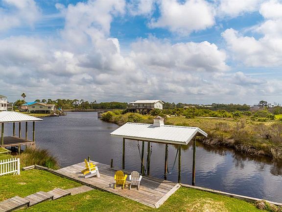 RELAX and UNWIND at this BEACH COTTAGE on LITTLE LAGOON! LIFE is sweet with the GULF just a short stroll away! UNIQUE beach house offering SOARING ceilings with generous living area, perfect for family and friends to gather AROUND the ROCK FIREPLACE! OPEN and bright living and dining spills out to over 500 square foot DECK overlooking the lagoon with pelicans and beautiful wildlife. Kitchen offers a touch of GOURMET with granite, custom back splash, stainless appliances and breakfast bar! VERY UNIQUE & FUN floor plan features two bedrooms downstairs with a shared bath. UPSTAIRS master is GIANT and features plenty of room and a large en suite bath with double vanity. PRIVATE balcony off master with PANORAMIC VIEW of lagoon and Gulf! Unique nook just outside of master perfect for a lounge or desk area! This DARLING is a TRUE STANDOUT! Nestled on a double lot with 100' feet of water frontage with nice grassy yard, small dock/boathouse, and double garage. FUN OUTDOOR area under house with OLD STYLE BRICK OVEN/GRILL. Some updates include metal roof, hurricane shutters, new windows after IVAN. Centrally located in the HEART of GULF SHORES! Buy this GEM and make it your OWN. It will NOT LAST. True charmer waiting for you!