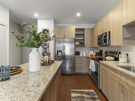 - Exterior features: **Available for private rental, *In select units, 8 foot entry doors, 9-13' ceilings, Bicycle rentals, Brew Station, Built-in wine racks*, Conference Room, Contemporary designer color scheme, Contemporary plumbing & light fixtures, Custom cabinetry with granite countertops, Flooring: Wood, Game Room, Monthly Resident Social Events, Oversized soaking tubs, Oversized windows with abundant natural light, Package Receiving, Pet Park, Pet Parlor, Private patios & balconies*, Recessed lighting, Stainless steel appliances, TV Lounge, Tile backsplash, Wi-Fi available throughout social spaces