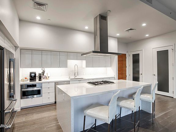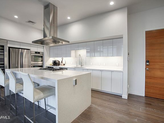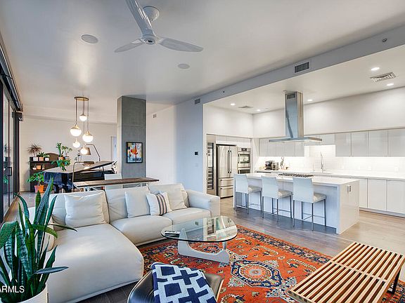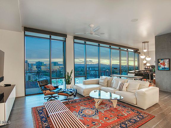 UNICORN ALERT! Never before has this floor plan been on the resale market, and it is no surprise why! The views from this South facing penthouse is breathtaking! Downtown views glistening in the sunrise or gorgeous Arizona sunsets become your living showcase with floor to ceiling windows on an entire unit spanning balcony. The floor plan is designed for comfort and entertaining, split bedrooms with an en suite guest room and 3rd bedroom on one side, and the primary bedroom with corner butted glass walls to truly capture that amazing view. Expansive primary bath with separate tub.shower, huge built in closet, lots of storage here! The island kitchen opens to the living room perfect for entertaining. First class amenities, suburb location, walk to restaurants, coffee, bars and the arts.