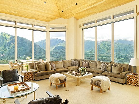 Red Mountain's premier view property. Enjoy stunning panoramics of Aspen Mountain, Highlands, Buttermilk, Mt. Sopris, and Independence Pass. This ranch style home is sited on a private one-acre lot with a grand approach. Great outdoor decks. Soaring ceilings, and generous living space.