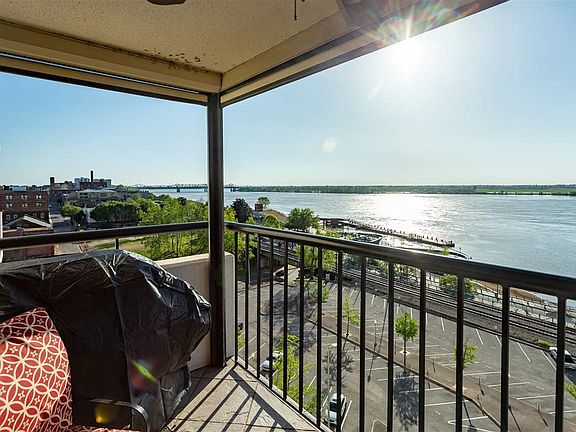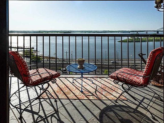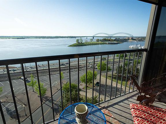Spacious end unit. Huge window & balcony to the West - Mississippi River! Huge window to the East - famous Beale Street! Many amenities including full time security. Updated kitchen w/stainless steel appliances, open plan that you must see! 2 car garage parking. Exercise room, clubhouse, sauna, etc.