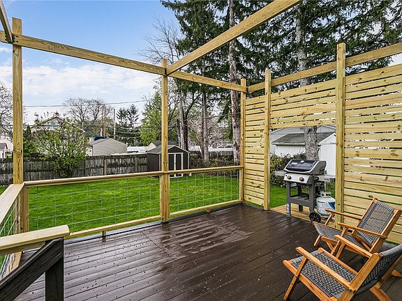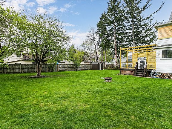 An updated & stylish 3 bedroom colonial with a double lot nestled in an adorable neighborhood in the East Irondequoit school district! Upon arrival you cannot miss the curb appeal this home has to offer with a beautiful, recently updated deck & a shed for storage! Inside you will be greeted with a lovely sunporch that guides you to an elegant entryway. The original hardwoods are engulfed with natural sunlight, thanks to the newer vinyl windows that flow throughout! The recently remodeled kitchen is absolutely STUNNING with contemporary tile, granite countertops, new hardwood floors & new appliances! The kitchen allows easy access to the backyard, the formal dining room or the bright living room, all incredible rooms to entertain in! Upstairs you will find a gorgeous full bathroom with a floating, double sink vanity and exquisite tile throughout. The 3 bedrooms are spacious with tons of storage! The master bedroom showcases a cedar plank accent wall & a brand new, walk-in closet! Cedar closets, rounded doorways & leaded glass windows throughout! There is also a walk-up attic & a partially finished basement! All appliances are included. Showings begin 5/5, Offers due 5/8 at 3pm.