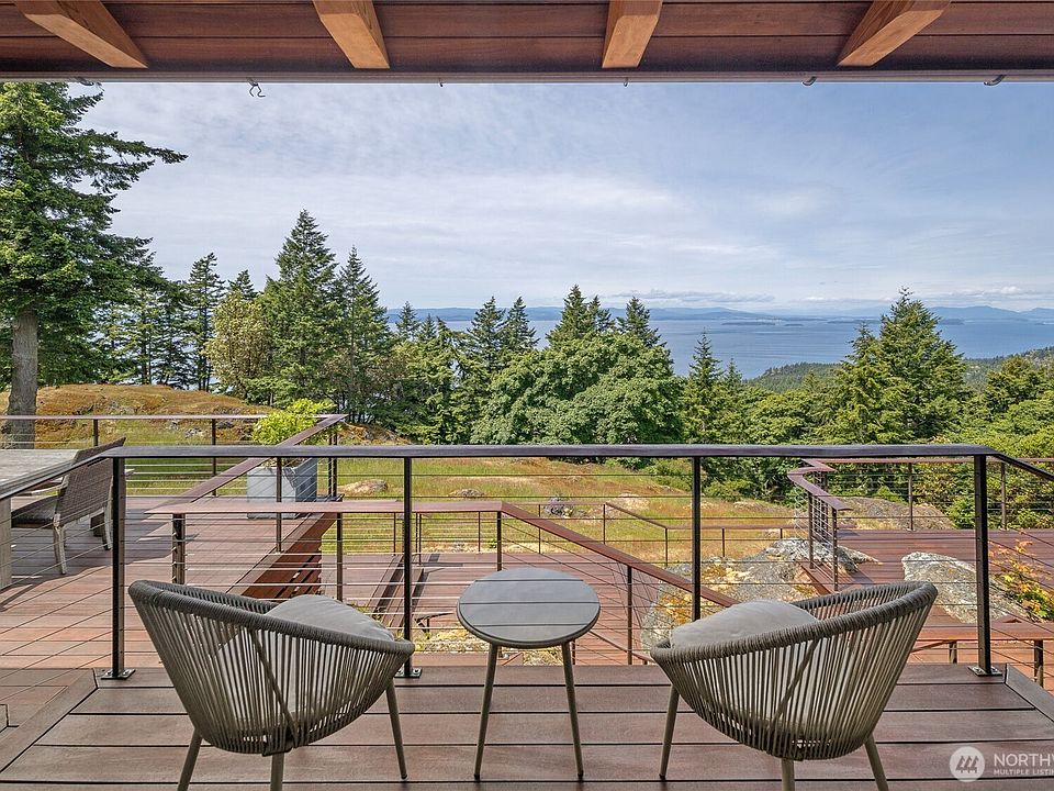 Commanding 360° views from its 22-acre perch atop Mt. Dallas, this extraordinary property spans 2 parcels and captures sweeping vistas from Haro Strait to Mt. Baker. The luxurious, tigerwood-clad main home features a grand living room with stone fireplace, chef’s kitchen with artisan cabinetry and high-end appliances, and 2 elegant water-view suites with spa-like baths. A separate guest suite with kitchen, woodstove, and steam shower offers ideal flexibility. A charming off-grid cabin adds rustic appeal with solar power, wood cook stove, and multi-level decks for dining, stargazing, or tent camping. With water storage, heat pump with AC, high-speed internet, and 2-car garage, this private, versatile retreat is the pinnacle of island living.