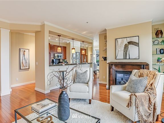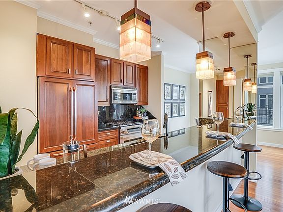Location, Location, Location! Former model on Seattle's Redeveloping Waterfront with views of the Sound and Olympic Mountains. The kitchen features Dacor appliances, cherry cabinets, thick slab granite counters, and an eating bar. Custom glass lighting. Cherry hardwood flooring. The master suite features a jetted tub, cherry cabinets, granite, and marble surfaces. 2nd bed/den features built-ins with a murphy bed. Huge sunny patio and a covered outdoor living area. Secured entry system, 24/7 concierge service, fitness room, hot tub, clubroom, roof-top deck, 3 storage units, and 2 assigned parking garage spaces. It is located at the base of the Pike Place Market elevator and across from the marina and the Marriott Waterfront hotel.