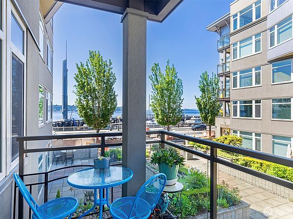 Live in the heart of Seattle's revitalized waterfront with views of Elliott Bay and glowing sunsets right from your unit. Walk score 94/100. Open plan features window shutters, high ceilings, new carpet and gas fireplace. Kitchen and both bathrooms with granite and contemporary fixtures. Master bdrm features 5 piece bath et generous walk-in. 2nd bdrm also function as office with built-in Cabinets/desk/murphy bed, 2 secure parking stalls, private storage, bike locker and no rental cap. LID assessment paid! 24-fir concierge, fitness center, spa, rooftop deck w/BBQ, club room, hobby & conference rooms & guest Suites. Airbnb potential.