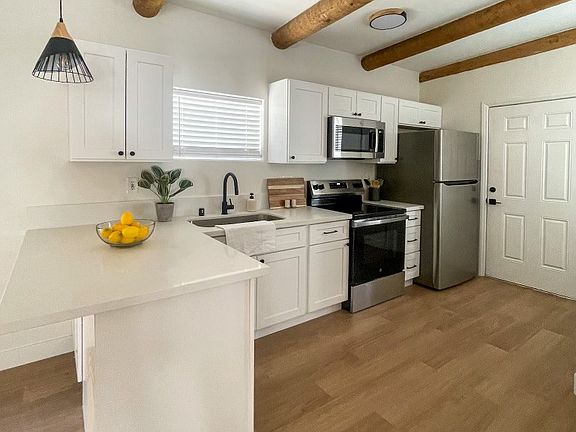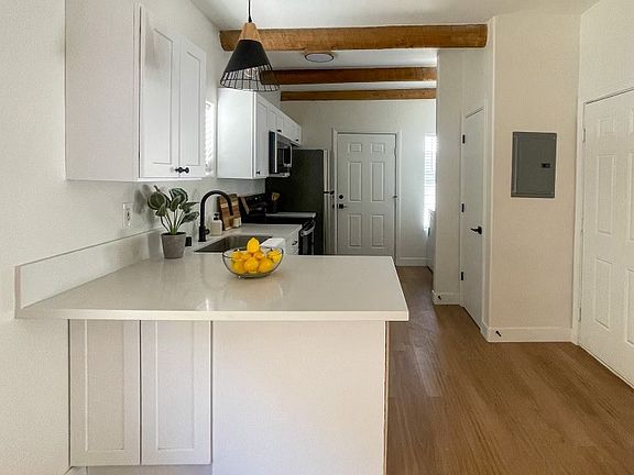 Fully renovated 2-bedroom, 2-bath unit in a fourplex available for rent! This stylish unit features a new roof, energy-efficient windows, and upgraded HVAC units designed to lower your utility bills. Inside, you'll find low-maintenance luxury vinyl plank (LVP) flooring throughout, adding both comfort and durability. The kitchen is a standout with brand-new cabinets and elegant quartz countertops, perfect for cooking and entertaining. Additionally, the unit includes a spacious 2-car garage, offering plenty of storage and parking space. No smoking allowed. Tenant is responsible for water, sewer, trash and electricity. Small dog allowed. Additional deposit of $150 required for keys and garage door opener. Non Refundable cleaning fee of $350. Property has desert landscaping and minimum cleaning is required. The tenant is required to keep the area around the unit clean. Property is the last steps of the renovation and will be completed by September 1. The photos are of a different unit in the fourplex. The appliances and finishes will be very similar.
