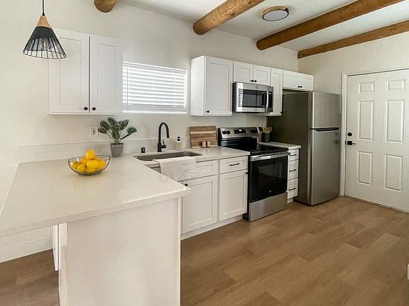 Fully renovated 2-bedroom, 2-bath unit in a fourplex available for rent! This stylish unit features a new roof, energy-efficient windows, and upgraded HVAC units designed to lower your utility bills. Inside, you'll find low-maintenance luxury vinyl plank (LVP) flooring throughout, adding both comfort and durability. The kitchen is a standout with brand-new cabinets and elegant quartz countertops, perfect for cooking and entertaining. Additionally, the condo includes a spacious 2-car garage, offering plenty of storage and parking space. No smoking allowed. Tenant is responsible for water, sewer, trash and electricity. Small dog allowed. Additional deposit of $150 required for keys and garage door opener. Non Refundable cleaning fee of $350. Property has desert landscaping and minimum cleaning is required. The tenant is required to keep the area around the unit clean. Property is the last steps of the renovation and will be completed by September 1. The photos are of a different unit in the fourplex. The appliances and finishes will be very similar.