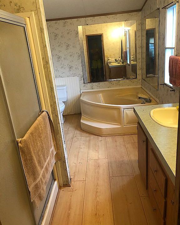 1792 sqft double wide , 4 bedrooms , 2 baths ,2 living rooms , laundry room and a covered patio. there is a 250 sqft finished shed or storage valued at $8000 the house is situated on a approximately one acre. due to the "texas freeze" all the house old pvc water pipes were replaced with brand new freeze resistance red and blue " pex " pipes. brand new 30 yr roof on house and shed brand new laminated floor in master bath.. there is wallpaper all through the house.all the windows are double pane.