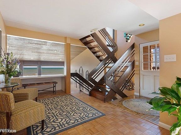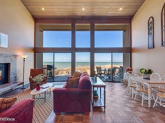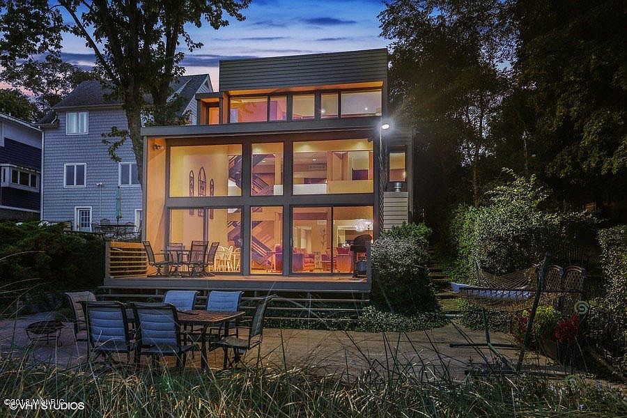 LAKEFRONT - WOW is what you'll say! Designed by J. Hyndman to capture sweeping lake views. Unassuming from road, but step inside to over 3,100 sf, 5 bedrooms and 5 baths - great natural lighting and almost every room has lake views. Beach level - main living area - two story great room, open kitchen, family room and more. Drop your "toys" in built-in storage on the way back from beach and enter through side door for easy access to 2 large baths (one with 2 showers) and generous laundry/storage. Mid level 24x14 multi-functional space with 2 built-in lake view work stations is circled by 4 bedrooms (one super bunk room) and 2 full baths. Master suite all by itself - top level. Great outside space with deck, patios and private off street parking. Septic passed with flying colors! Sea wall - yes. Masterfully designed - worth a look!