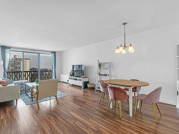 Light and bright, updated 2 bedroom/2 bathroom is available for rent. Hardwood floors throughout. Kitchen opens to generous dining area and living room. Open terrace overlooking the recreation deck and GWB from living room. Main bedroom has a bonus walk in closet for extra storage. Both bathrooms have been nicely renovated. Med South offers 24hr concierge/security service, in house management/maintenance staff, community room, library, athletic courts and outdoor pools. Gym requires $15/month membership fee. Parking assigned by management, where available. Perfectly located in town : Close to NYC bound transportation and NJ highways. Near to LG Headquarters. Excellent restaurants in the area to dine in or take out. Landlord has an internet contract they are willing to turn over to the potential tenant. Otherwise, Spectrum or Verizon are cable providers. A 2 year lease is required .