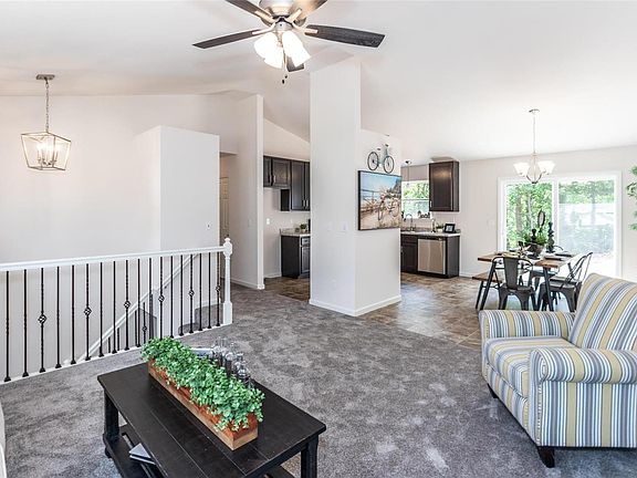 Welcome to this beautiful 3-bedroom, 2 full bath split foyer home with approximately 1,250 sq ft of living space! There are vaulted ceilings in the Kitchen, Breakfast, Great Room, Entry Foyer, and Master Bedroom. The oversized 2-car garage is nearly 26 ft deep by 23 1/2 ft wide. The Kitchen boasts beautiful 42" tall custom cabinets with wood ends, heavy duty hidden hinges, 8" deep stainless sink, pantry, and an upgraded faucet. Oh, and did I mention the stainless-steel appliances? Enjoy the cool nights with the direct vent gas fireplace with custom marble surround and beautiful detailed mantle. The bathrooms offer adult height vanities and there is brushed nickel hardware throughout. This home backs to trees and woods for added privacy. The outside of the home displays custom colored soffit, facia, and gutters with viny! handrailing at covered front porch. Fully sodded yard installed, weather permitting. Call today, this home won't last long!!