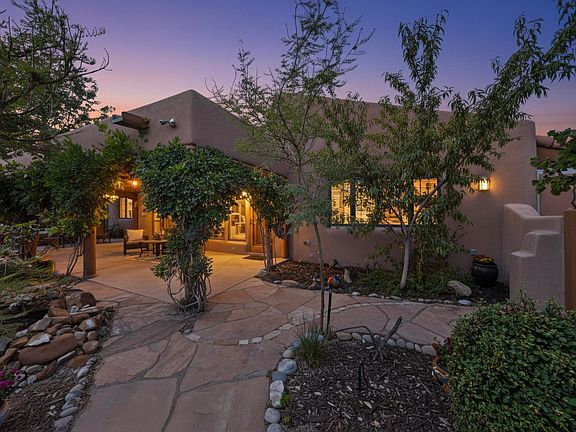 WELCOME HOME!!! Experience breathtaking Sandia Mountain views from this 7.0-acre pueblo-style retreat on a private cul-de-sac in Rio Rancho. Zoned E-1, perfect for horses, this property offers both privacy and convenience. Enter through a hand-carved gate to a lush courtyard and covered patio. Inside, discover viga ceiling beams, adobe brick foyer, kiva fireplace, and a sun-filled solarium--ideal for an office or garden room. Gourmet kitchen boasts custom cabinets, marble counters, island, and stainless appliances. Owner's suite features a solarium sitting room and spa-like bath. Attached casita with 2 bedrooms, bath, and sitting room. Outdoors: gardens, water features, hot tub, Swim spa pool, two 3 car garages, and owned solar.