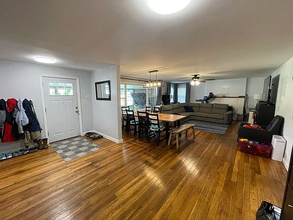 Tucked off the street, this 3 bedroom home with basement in Urbana is a great find! Sitting on nearly half an acre, the deep front yard and covered front porch create an inviting welcome. Once inside, you'll appreciate the open sight lines and low maintenance wood flooring in the spacious living and dining area. The eat-in kitchen features crisp white cabinetry with contrasting counters, stainless appliances, and a butcher block peninsula with extra seating and storage. The three bedrooms all feature hardwood floors with the master highlighted by a walk-in closet. The main bathroom gives you great space with double sinks and tiled shower with the added convenience of a separate half bath. You'll find additional storage in the unfinished basement, detached garage, and garden shed. Newer roof & HVAC. Schedule your showing today!