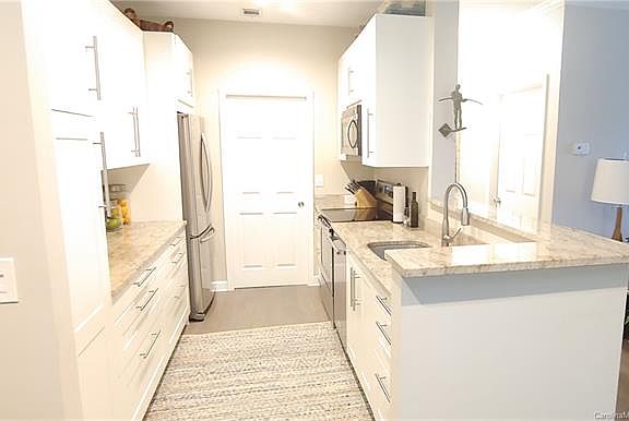 Renovated and ready! Immaculate condo has 9' ceilings throughout with crown molding ; Corner unit with lots of windows and natural light ; Updates include: commercial-grade sound-reducing cork flooring that looks like wood; white kitchen with granite counters; master bath shower, floor & vanity; fresh paint and more ; Kitchen has pantry with pull-outs, 40" cabinets and SS appliances ; Open floor plan ; All 3 bedrooms have generous walk-in closets ; Master closet has built-ins ; Mountain view from dining table ; Wood-burning fireplace in living room feature wall ; Separate laundry room ; Storage closet for tools ; Includes 1-car garage ; Super clean and well-maintained ; Great location! 5 Minutes to downtown Asheville plus easy access to Blue Ridge Parkway, I-40 and I-240 ; Neighborhood grocery, pharmacy and restaurants ; If you want turn-key in Asheville, this is it!