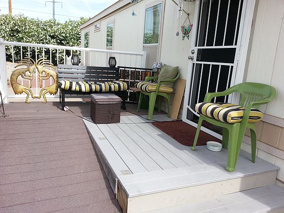Located in Beautiful Buena Vista Mobile Home Park this quaint 2 bedroom features a front end/road kitchen and bar top island with plenty of cabinets in a Great room combination. There is laundry space with a full size washer and dryer and overhead cabinets. New fixtures throughout, new 2017 40 gallon water heater, new laminate wood floors throughout except bathroom is vinyl, stove and refrigerator stay, mostly indigenous plant's in yard saves on watering Out the front door the deck has a built-in wheelchair ramp for those in need or can easily be removed. Walking out the backdoor is a back deck leading to the fenced backyard and covered driveway.