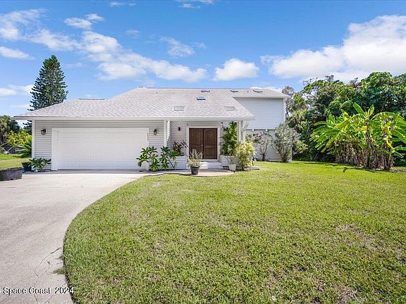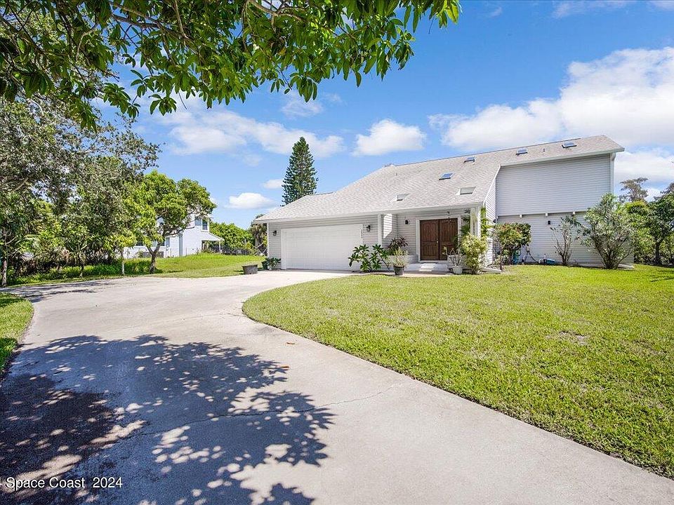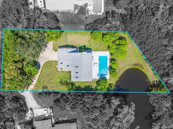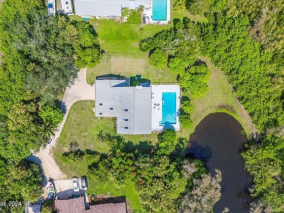 New improved price! This unique South Merritt Island pool home is no cookie-cutter and sits on .7 acres of private, natural beauty. Custom designed with a stunning entry and bountiful natural light, the interior offers extra large rooms, a second story balcony and a 26 x 9 enclosed rear porch with its own mini-split AC not included in the living square footage of the home. The backyard paradise features a huge sparkling pool (recently resurfaced), a natural pond and numerous mango trees. You'll delight in a wood burning fireplace, new tile in the wet areas and rear porch, double ovens and electric cooktop in the kitchen, master bath with large walk-in shower and central vac. Outside conveniences include available RV/Boat parking area, new septic (2021), hurricane rated doors and windows in the enclosed porch and shutters for all other windows. Conveniently located just south of Rotary Park off S Courtney Pkwy. Shopping and amenities just minutes away via SR 520, 15 min to the beaches.