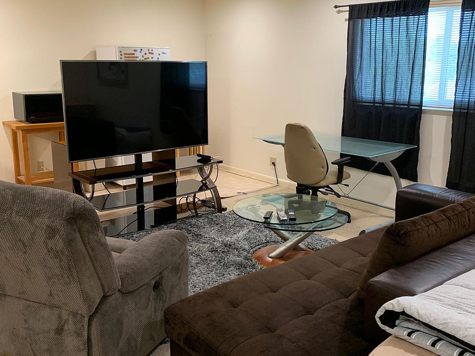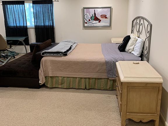 Cute efficiency apt on second floor above garage, approximately 20' x 20' with full bathroom and kitchenette. The efficiency is furnished including comfortable kingsize bed and 65"television. Lots of closet space - see photos. Great Boca location near Town Center Mall. Private entrance on ground level. Walk up stairs to the apartment. Back yard has Picturesque pool on lakefront with gas grill to be shared. Off street driveway parking space for one car. Utilities: internet, electricity, water and trash INCLUDED. Own central AC unit. Small , well behaved pet will be considered. First, last and security. Should be available Feb.02,2022. Must have good references and credit score. NO SMOKERS PLEASE! NO SMOKING. Requesting first, last and security to move in. Can be paid in 2 payments. Minimum 7 month lease. Month to month after. Owner pays all utilities and internet. Must like dogs. I have friendly Staffordshire terrier.