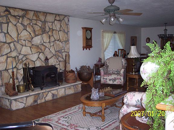 Large custom view home on one acre with views of Valley Peaks features 3 Bedrooms 2 Baths with bonus room that could be used as fourth bedroom (has closet) and a den with fireplace. The open floor plan features the living, dining, and kitchen with a balcony for BBQing. Stainless steel appliances and maple countertops makes preparing meals a breeze. Expansive storage closets just off the stairs provides plenty of storage space. The Master bedroom with 3/4 bath finishes off the upstairs. The downstairs features Family room with a stone fireplace, two bedrooms, full bath, and bonus room with access to the backyard. A detached workshop and storage area are located to the rear of the property. Horses are allowed. The expansive lawns allow for many outdoor activities. This property is outside of the Sewer Moritorium and has its own well.