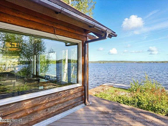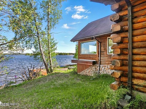 Amazing opportunity to own 4 contiguous South Facing road accessible lots on Biglake. With a combined 1.4 acres & approx 380' of lake frontage. 2,250sf log home W/full utilities & another 700sf cabin W/elec heat. Tons of options W/ 4 separate parcels. Largely a turn key opportunity includes pontoon boat, plow truck, Snow machines, 4-wheeler. One of only two road access Biglake homes on market.Desirable location on Big Lake with direct southern exposure for sun on the docks and decks all day long. Expansive mountain and lake views & loads of natural light through the lake front windows of both cabins. Property has gentle slope down to lakefront with boat ramp roughed in next to log cabin. The log home has two private bedrooms with additional sleeping space in the loft area. The walk-out basement has a wall of windows for abundant natural light and live edge wood bar facing the lake and a door leading to the concrete pier/patio area perfect for morning coffee, picnics during the day, and fires at night. Basement is set up as a TV/Game room and has a space that would be great for an additional bedroom. Log home also features security system with multiple cameras to monitor the home while you are away and multiple systems including heat and lights can be operated remotely from your phone or computer via DSL for high speed internet / streaming services with wireless connectivity throughout the cabin. Log home has central oil heating with 500 gallon main tank and additional 300 gallons back up. The smaller cottage next door has a wonderful close to the lake location with a boat house feel. With the wall of windows in the living room/kitchen area you also have expansive lake front and mountain views. Walk directly from the cottage deck out to the roomy piling dock with boat/float plane slip. Cottage has ample electric baseboard heat and a roomy private bedroom. This is a fantastic cottage, guest cabin or possible future Airbnb. There is also a large storage shed with room for up to 3 snow machines and other gear and an additional original historic cabin in need of TLC ready to be made into a cute playhouse or bunkhouse. A full price offer will include a 24' pontoon boat, 2001 Chevy Silverado 2500HD truck and plow, 3 low hour snow machines and four wheeler with plow. Owner willing to sell Lots 1 & 2 MLS # 25-5037 and Lots 3 & 4 separately