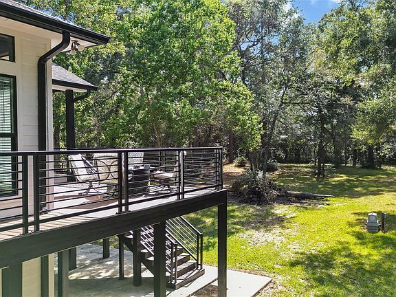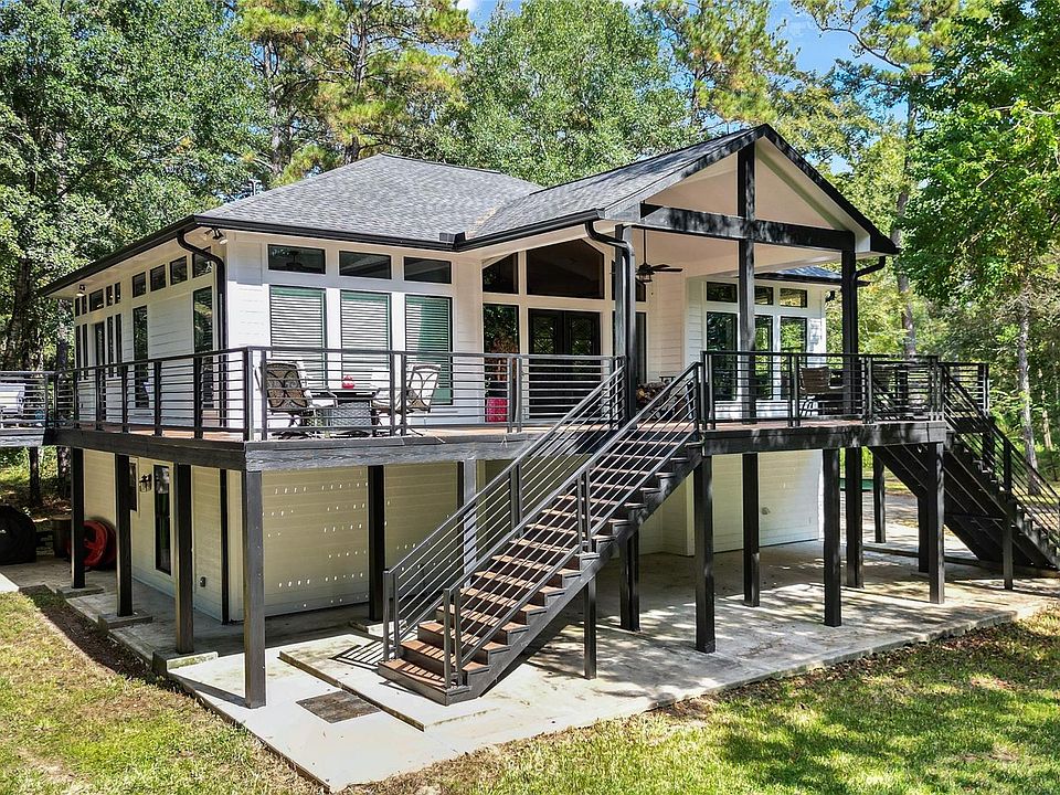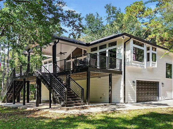 Escape to 5 private acres designed for connection to nature. The 2-story, 3 bed, 2.5 bath home has an extensive Trex deck with contemporary railings, multiple seating areas, and views of dense woods with no neighbors in sight. Inside, cathedral ceilings, refinished hardwoods, and a dual wood-burning/gas fireplace create an inviting living room. The island kitchen shines with granite counters, SS appliances including double ovens, and a dining area with a cozy window seat. The primary suite offers deck access, and a spa-like bath including double sinks, a clawfoot tub, and walk-in shower. Downstairs find two additional bedrooms and Jack & Jill bath, all with honed slate tile flooring. Outdoors, a 1,200 sf covered patio, and private driveway with gated entry make this property a secluded find. Residents enjoy a private 160-acre recreational lake, parks, boat ramp, sports fields, riding trails, & more. Low tax rate, no MUD, close to 99 & 249! New low-e windows, roof replaced 2018.