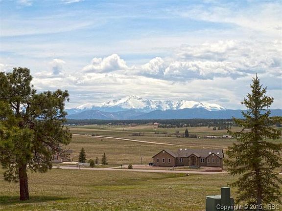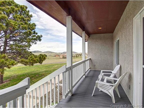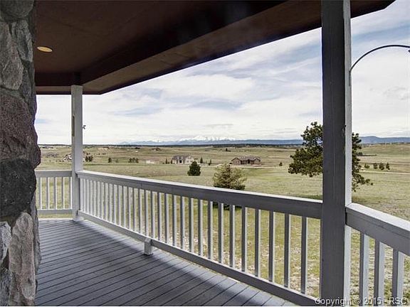 Located high on the hill on 6.41 acres, this home has amazing views of Pikes Peak. Views can be seen from the living room, master bedroom and even the walk out basement. Relax on the front covered porch while enjoying the mountain views. Open main level floor plan is great for entertaining. Kitchen is spacious, has walk-in pantry, and walkouts to the large deck. Private main level office located just off the large mudroom. Formal dining room has chair rail and crown molding. Spacious master suite has French doors, lots of windows, and luxurious bathroom. Three additional bedrooms, two full bathrooms, and laundry room are also located upstairs. Walk out basement has large family room with wood burning fireplace, guest suite with its own full bathroom, 1/2 and 400 sq ft of storage space. Great location in District 38 schools with easy access to both Denver & Colorado Springs, Home is clean and ready for new homeowner.