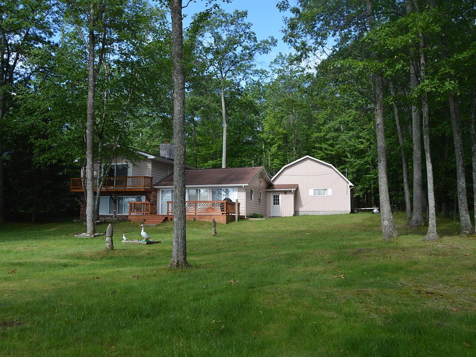 Large good condition Long Lake home on 6 acres and adjoining state land. The home features a large lake side yard looking out over the larger portion of the lake and the island. Quiet and secluded area. An attached garage with loft storage and a large detached barn with finished living space above it. Kitchen, living room, dining room, family room, and master bedroom all look out over the lake. The master bedroom has a private lakeside balcony as well. There have been some recent updates to the roof and chimney. Driveway is black top. Long Lake is an all-sport lake known for great water temperatures, excellent fishing, and beautiful views. There is also a no wake portion of the lake which is great for paddling. The lake has a sandy bottom in front of the house.