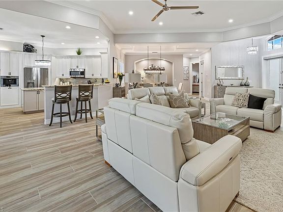 Great Opportunity to live the grand resort life in the highly desirable Villa Grande community @ Grandezza! This totally renovated 3 bedroom 3.1 bathrooms, with den and lots of storage, comes tastefully decorated and has an open floor plan that's great for entertaining. New Roof (2023) New Pool & Spa (2023) A/C (2020) and the screened lanai area has outdoor kitchen with TV and fireplace. The primary bedroom suite has custom design walk-in closet and ensuite bathroom has dual sinks, separate jacuzzi tub and custom shower. The kitchen has custom layout with eat-in kitchen, large pantry, European coffee station and wet bar / wine cooler. Enjoy Grandezza's Country Club community with golf, tennis, wellness center and fitness club, clubhouse pool and cabana as well as casual and fine dining. Close to shopping and restaurants and minutes from SWFL International Airport.