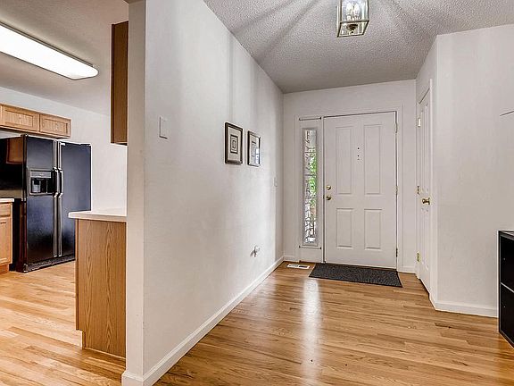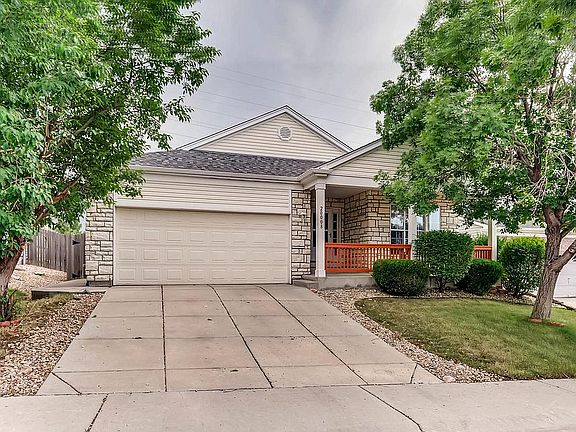 Spacious and desirable ranch home with open floorplan, updated kitchen with black and stainless appliances, plenty of counterspace and cabinets as well as an eat in kitchen with hardwood floors and new backsplash. There is a pass through to huge living/dining space/great room with vaulted ceilings and has patio doors open to mountain views of Pikes Peak as well as small backyard backing to open area with trail access. There are 2 additional bedrooms with a main bath, main floor laundry & master suite with 4 piece bath and new wood laminate flooring. Partial basement of 832 sf with large egress windows ready to finish. New carpet throughout, some new appliances, central a/c 1 year. Lots of sunshine and easy one floor living with large entry/foyer. Close to highways, trails, shopping as well as easy access to DIA.