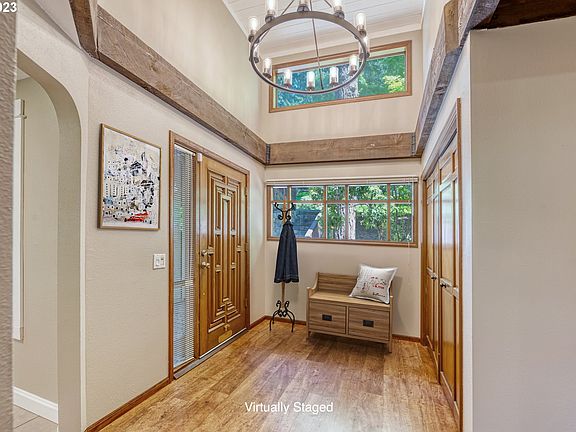 Northwest Inspired. Nestled among nature, enjoy a park like setting in the heart of town. Finishes & amenities incl. an updated kitchen, open beam vaulted ceilings, wood burning fireplace, skylights, abundant outdoor living space & hot tub, formal & informal dining, gas furnace w/central air, and glowing wood accents throughout. The flexible floorplan offers both living room & family room w/additional flex space that could serve as office or 4th bedroom. Easy access to the Hendricks Park Ribbon Trail.