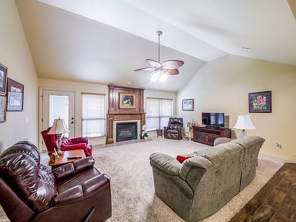 Absolutely gorgeous!! This attractive, well cared for three bedroom, two bath brick home is located on a charming corner lot in the highly sought after Wedgewood Neighborhood. It features an open floor plan, arched doorways, a high vaulted ceiling in the living room and a fireplace with exquisite custom woodwork and detailing designed by a true craftsman. The beautiful rich brown wood cabinetry throughout the home looks expensive, warm and inviting and is rarely found in a home in this price range. The kitchen has a beautiful granite countertop with an eat-at bar, a complimentary backsplash of natural stone travertine tile laid in a diagonal pattern, popular stainless steel appliances and an abundance of storage. The long granite bar is delightful as a buffet serving area when entertaining family and friends. The staggered heights of the upper kitchen cabinets are a nice area for displaying favorite collectibles. There is a cabinet area between the dining room and kitchen that could be a coffee bar or small butler’s pantry. The dining room has a high vaulted ceiling with ceiling fan and a large window with a view of the front yard. Porcelain tile flooring, with a rich brown wood-grain look, is laid in the entryway and the main hallway to the living room and master suite entrance. The large master bedroom features a trey ceiling with ceiling fan, cream carpet and windows with a view of the backyard. The deep oval soaking tub is a focal point in the master bathroom along with the vanity with double sinks, separate shower and walk in closet with built in drawers. The third bedroom also has a high vaulted ceiling with ceiling fan and an arched window facing the front of the home. The beautifully landscaped backyard has a privacy fence and large storage building. Tour this lovely home today and move up to inspired living!