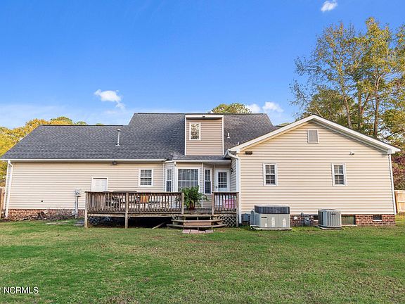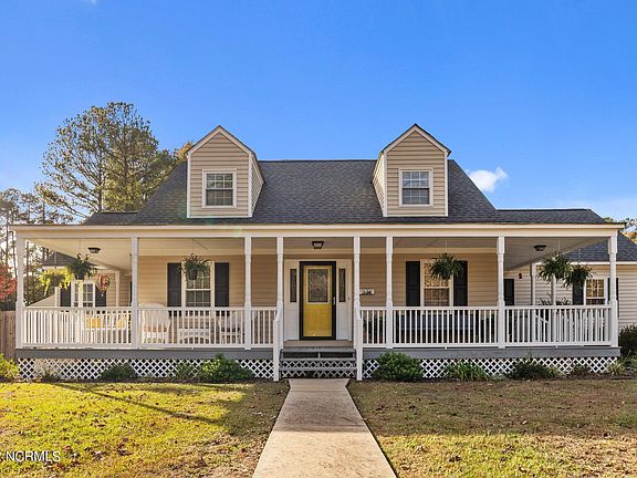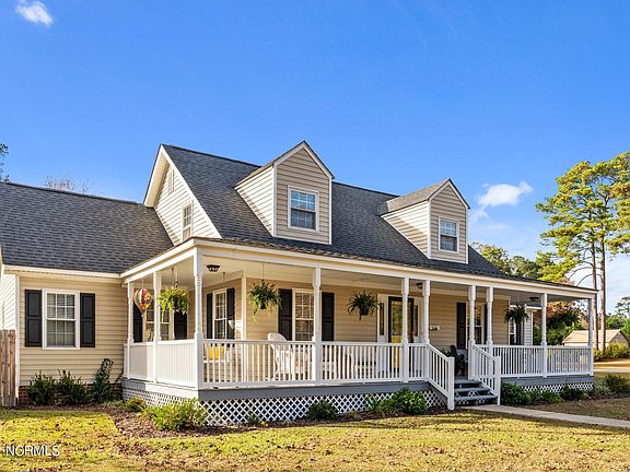 The centrally located front entrance is accessed from the street via a beautiful bridge. The full wrap around front porch is so peaceful and serene. This allows impressive access into the home. There is a large great room with a fireplace and surrounding window views. The adjacent dining room and kitchen feature great space for prepping and enjoying casual and special occasion meals. The dining room features beautiful sunlit views onto the wraparound porch and front lawn, making entertaining both functional and effortless. The updated kitchen is highlighted with a large center island that offers casual seating with a full window, a separate pantry and plenty of additional counters and cabinet space. A storage room, powder room for guests and a large laundry room with sink and counter space are located on the main floor as well as the owner's suite. The primary bedroom is spacious; features window views and access into the en suite attached bath. An abundance of modern conveniences is found in the bath that includes dual separate vanities, a garden tub and separate shower. The owner's walk-in closet affords plenty of room for clothing and other personal accessories. The upper floor of this home contains two secondary bedrooms, a full bath, and a flex/storage space. The unfinished flex space, with sloped ceiling heights, could be used for a teen-age lounge or a playroom for younger children. Both bedrooms have double window views, and generous closet space. The full hall bath features bountiful counter space and tiled tub/shower combination. This is a beautiful corner lot in convenient, quiet neighborhood. This home features a fully fenced-in, private level back yard, perfect for pets. In addition to the attached 2-car garage there is a heated and cooled detached garage with 1/2 bath inside the garage/workshop. This fabulous Farmhouse design is visually pleasing, offers quiet outdoor living and entertaining with a desirable floorplan.
