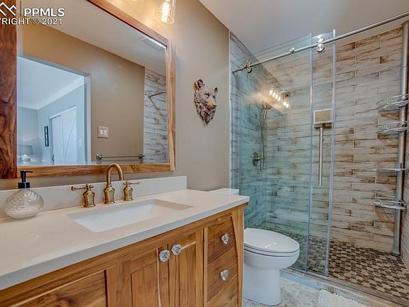 Ideal location! Nestled on a large lot in School District 12, this Rancher with a finished basement is a must see. Great kitchen lay-out features nearby dining room, gas cook top & wall oven. Newer tile floors throughout the kitchen and entry.Private master suite has two closets, a stunning updated attached bath and walk-out to the large newer deck and beautiful back yard. There's a wood-burning fireplace in the living room that could easily be converted back to gas...and, a wood burning stove in the lower level.The rec room could also be a 5th bedroom with enough space to be separate living quarters. New roof this year that includes solar panels (owned), the electrical system has been replaced with a new panel and wiring, several windows have been upgraded to vinyl. The back yard fence has been replaced. There is ample storage throughout the home, deep garage with workbench, RV & boat parking area next to the garage, circular driveway, professional landscaping and so much more!