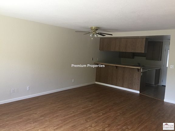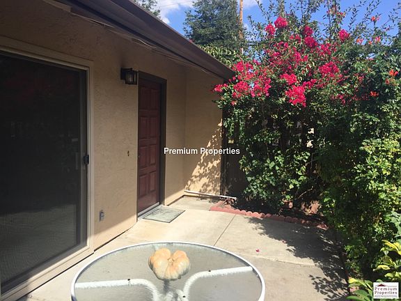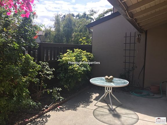 Gorgeous single level end unit with gorgeous laminate flooring, new paint, and beautiful bathrooms! It has approximately 930 square feet of living space and is close to shopping and restaurants. Walk into the entry with large coat closet and living room with large slider to front patio. Informal dining area is between living room and kitchen with ceiling fan. Plenty of room for dining table and chairs. Kitchen is spacious and features Formica counter with breakfast bar between kitchen and eating area, linoleum flooring, fridge, dishwasher and 4 burner flat electric stove and oven. Lots of cabinet space. There is an Electrolux stackable washer and dryer in a closet off of the kitchen. There is a door leading to the back patio. The hall half bathroom is nice. It features a single sink and vanity. Bedroom 1 is good sized and features large closet. The master bedroom is also good sized and has a large closet with mirrored closet doors. The master bathroom has been remodeled and features a large shower stall, tile flooring, and large vanity with single sink. The hallway has a linen closet. This is a great unit, with a great location! It features central heat and A/C, a single car detached garage, access to community pool and tennis courts! Water and Garbage service included with rent. Two exterior patios enclosed with fence. No smoking. No pets. Please call Darcy with Premium Properties (925) 286-4891.